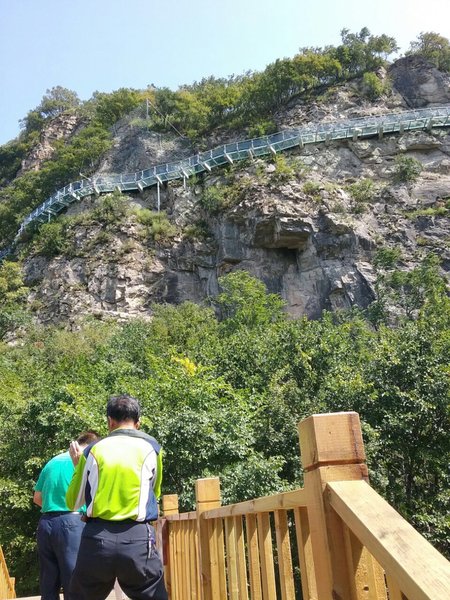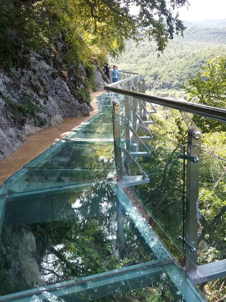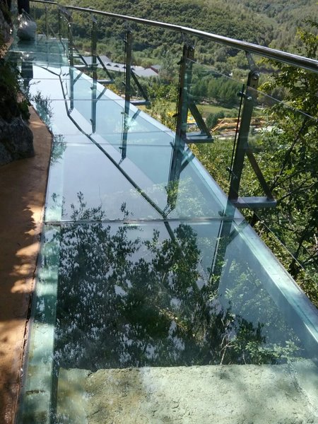 «Мостик» выполнен из самого настоящего стекла толщиной всего 6 сантиметров и шириной не больше метра, стеклянный пол, стеклянный бортик, с одной стороны отвесная скала, а под ногами бездонная пропасть.